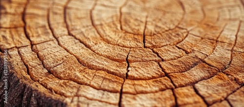 © GenZGraphics, Fototapeta premium Detailed close-up of a cut tree trunk showing annual rings and texture with natural wood patterns Copy Space