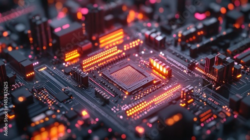 © Miftachul, Obraz premium Detailed close-up of a glowing circuit board
