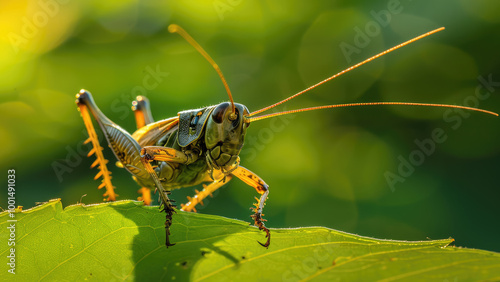 Fototapeta premium Detailed close-up of a grasshopper on a rock