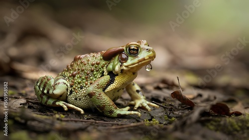 Fototapeta premium Detailed close up of a green and brown warty toad with a water droplet on its...