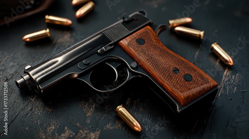 Fototapeta premium Detailed close-up of a handgun displayed among scattered bullets on a dark wooden surface during a focused still life arrangement