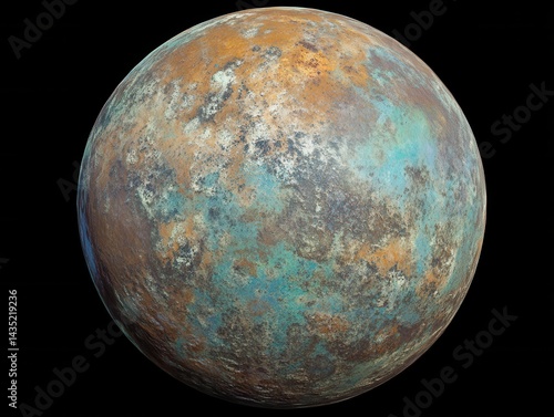 © EchoFrame, Fototapeta premium Detailed close up of a planet with a textured surface in shades of brown orange and blue on a black background creating a sense of depth and mystery