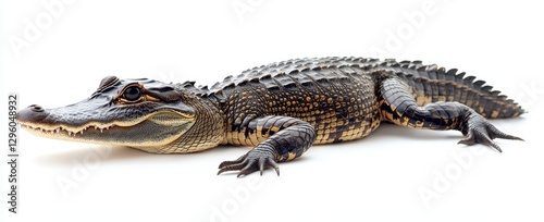 © ANUAR, Naklejka premium Detailed Close-Up of a Young Alligator Lying on a White Surface, Showcasing Distinctive Scales and Textures of Reptilian Skin in a Studio Setting