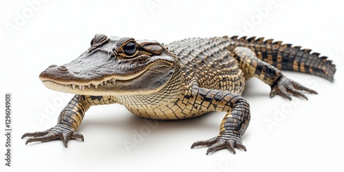 © ANUAR, Naklejka premium Detailed Close-Up of a Young Alligator on a White Background Highlighting Texture, Color, and Features of a Reptile in a Studio Setting