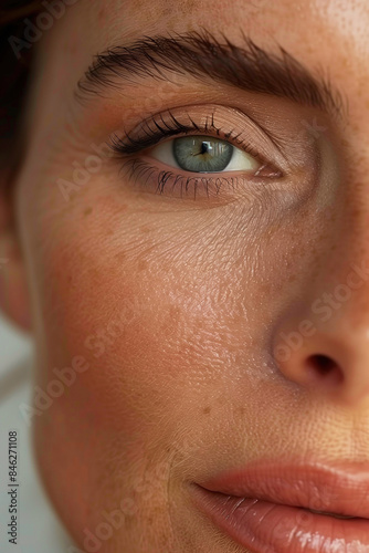 Fototapeta premium Detailed Close-Up of a Young Woman in Her 30s with Glowing, Healthy Skin, Without Makeup