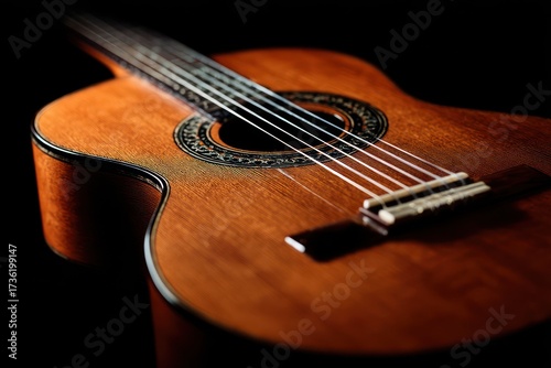 © Igor, Fototapeta premium Detailed Close-up of Acoustic Guitar on Black Background