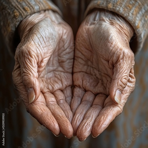 © Shahid, Fototapeta premium Detailed close-up of backs of hands with wrinkles showing aging skin, natural lines, and texture variation ideal for age representation, dermatology visuals, and skincare themes --raw --stylize 250