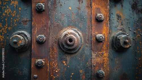 © Khaisan, Fototapeta premium Detailed close up of corroded metal surface featuring bolts and rivets texture