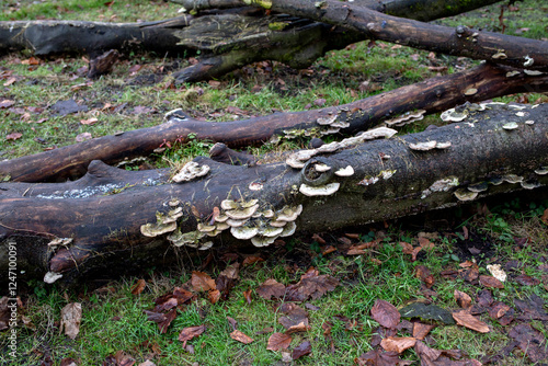 © Smetana , Fototapeta premium Detailed close-up of fungi growing on a decaying tree trunk