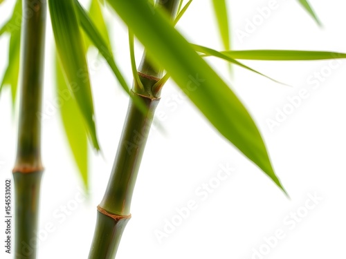 © SAGMA DESIGNS , Obraz premium Detailed close-up of green bamboo stalks and fresh leaves with brownish nodes, illuminated by soft light and set against a bright white blurred background – ideal for natural themes