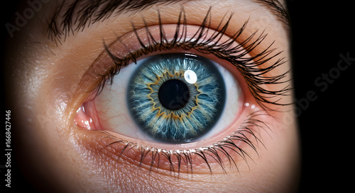 © Aldy, Fototapeta premium Detailed Close Up of Human Eye with Blue Iris and Long Eyelashes