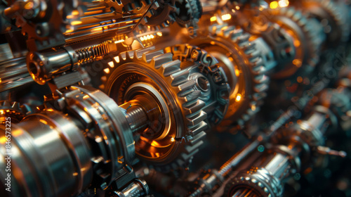 Fototapeta premium Detailed close-up of interconnected industrial gears in motion, showcasing...