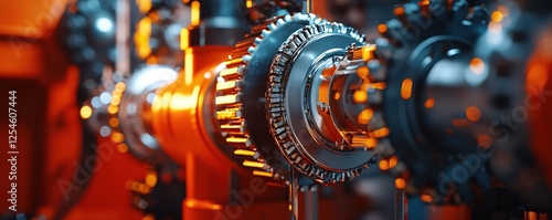 Fototapeta premium Detailed Close Up of Intricate Gears and Cogs with Orange and Blue Lighting Industrial Art