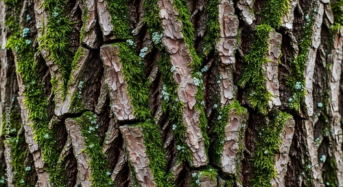 © Kopi, Obraz premium Detailed Close-Up of Textured Tree Bark with Green Moss.