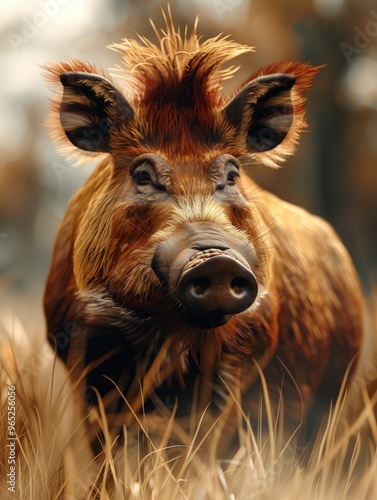 © Nataliia S., Fototapeta premium Detailed close up of Warthog, Phacochoerus, in its natural grassy environment