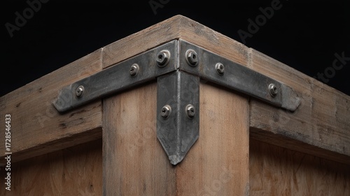 Fototapeta premium Detailed Close-Up of Wooden Corner Joint with Metal Bracket and Screws Against Black Background for Craftsmanship and Architectural Design Inspiration