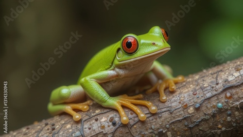 © wiwat apisithpinyo, Naklejka premium Detailed Close-Up Portrait of a Green Frog with Red Eyes on a Branch in a Lush Rainforest