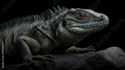 Obraz premium Detailed close-up portrait of an iguana with textured skin, set on rock.