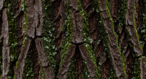 © basain, Obraz premium Detailed Close-Up Wood Bark With Green Moss