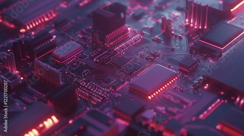 © Amien19, Obraz premium Detailed Closeup of a Modern Motherboard with Illuminated Components and Circuits