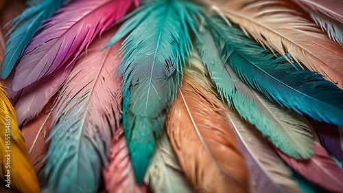 © WRONESIDED, Fototapeta premium Detailed closeup of multicolored feathers with soft natural light