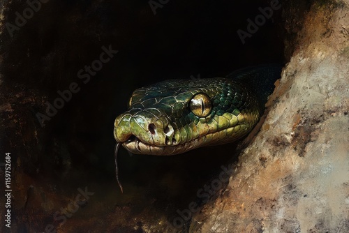© NATURALFAMILY, Obraz premium Detailed closeup of python emerging from dark cave