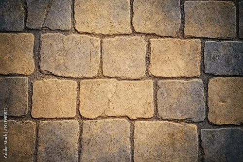 © Riz, Obraz premium Detailed Cobblestone Pavement Texture in Earth Tones Featuring Interlocking Geometric Blocks Creates a Durable and Visually Appealing Outdoor Surface for Pathways and Driveways
