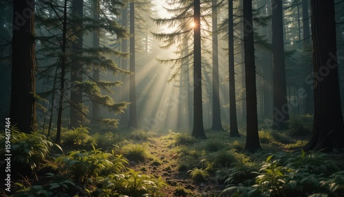 © Aumporn, Obraz premium Detailed Coniferous Forest with Morning Dew Photorealistic Style