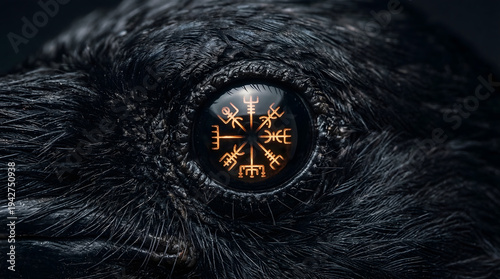 © arief, Naklejka premium Detailed Crow Eye Reflecting Burning Orange Viking Rune Circle