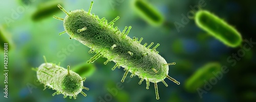 © BonzEarthsnapper, Naklejka premium Detailed 3D Rendered Visualization of Bacteria Forming Impenetrable Structures in a Vibrant Green Background for Scientific Illustration