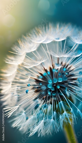 © Coffee_Reflections, Obraz premium Detailed dandelion seeds with blue droplets