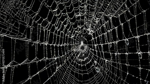 © Nardo leo, Naklejka premium Detailed Dew-Covered Spider Web Glows in Dim Light, Capturing Nature’s Intricate Patterns and Beauty