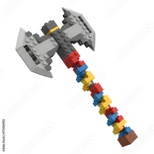 Fototapeta premium Detailed Double-Headed Battle Axe Built from Colorful Toy Blocks isolated on...