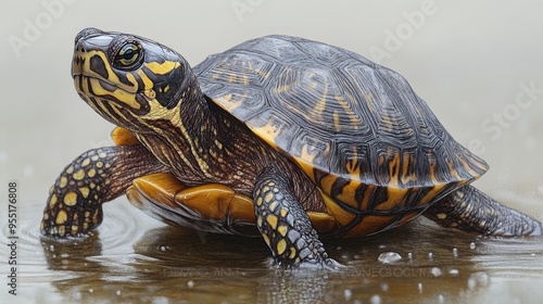 © Rinowz, Obraz premium Detailed drawing of a box turtle showcasing its unique hinged shell and patterned carapace