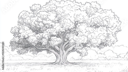 Fototapeta premium Detailed drawing of a large tree in a landscape. Possible use Educational...