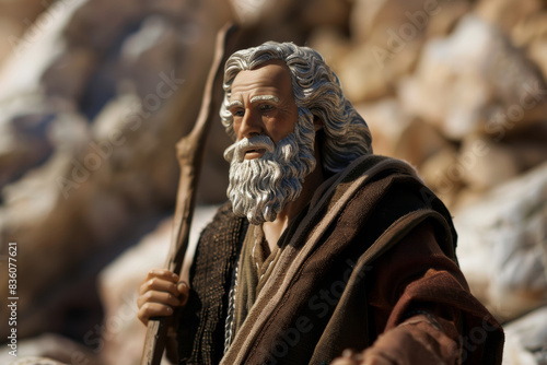Naklejka premium Detailed figurine of a bearded elder with a staff against a rocky background.