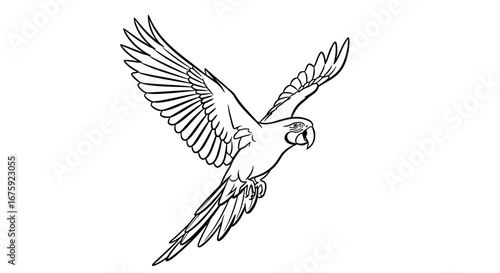 © Ilma, Fototapeta premium Detailed flying parrot line art illustration, tropical bird in flight drawing.