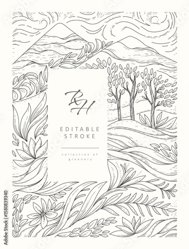 © merfin, Naklejka premium Detailed frame illustrated with landscape and floral elements. Luxury elegant brochure for wedding invitation, wallpaper art or save the date card. Editable stroke vector