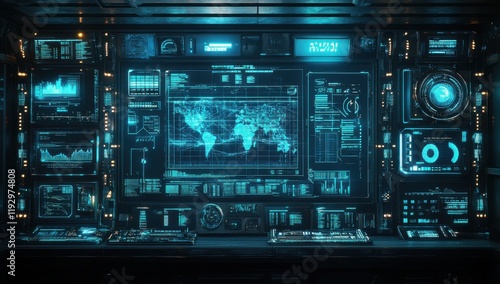 Fototapeta premium Detailed Futuristic Control Room Displaying Global Map and Data Analytics...