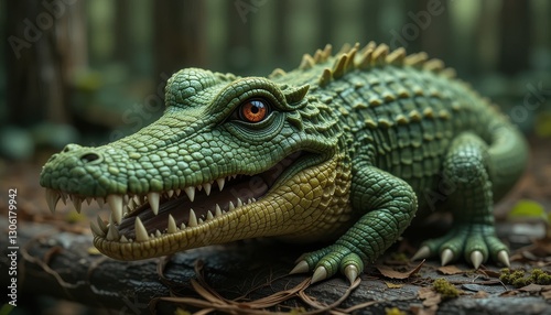 © Ai DreamscapesTH, Obraz premium Detailed Green Crocodile Figurine Posing in Forest Setting High Quality Reptile Model