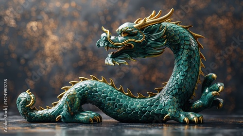 © Ghulam, Obraz premium Detailed green dragon sculpture with golden accents on a dark background HD 8K wallpaper Photographic Image