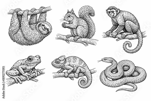 Fototapeta premium Detailed hand-drawn animal illustrations of sloth, squirrel, monkey, frog, chameleon, and snake
