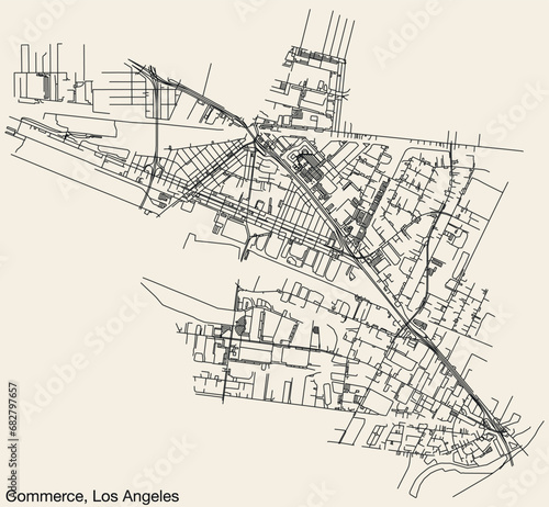 © Sanja, Obraz premium Detailed hand-drawn navigational urban street roads map of the CITY OF COMMERCE of the American LOS ANGELES CITY COUNCIL, UNITED STATES with vivid road lines and name tag on solid background