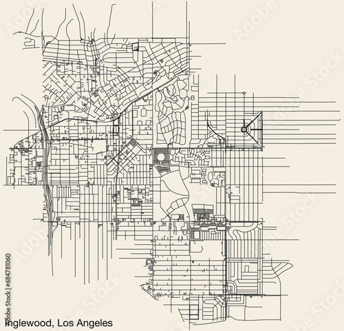 © Sanja, Fototapeta premium Detailed hand-drawn navigational urban street roads map of the CITY OF INGLEWOOD of the American LOS ANGELES CITY COUNCIL, UNITED STATES with vivid road lines and name tag on solid background