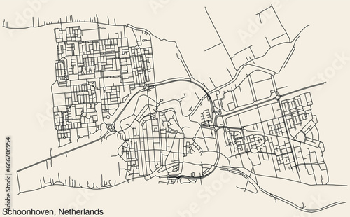 © Sanja, Fototapeta premium Detailed hand-drawn navigational urban street roads map of the Dutch city of SCHOONHOVEN, NETHERLANDS with solid road lines and name tag on vintage background