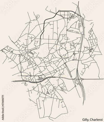 © Momcilo, Fototapeta premium Detailed hand-drawn navigational urban street roads map of the GILLY MUNICIPALITY of the Belgian city of CHARLEROI, Belgium with vivid road lines and name tag on solid background