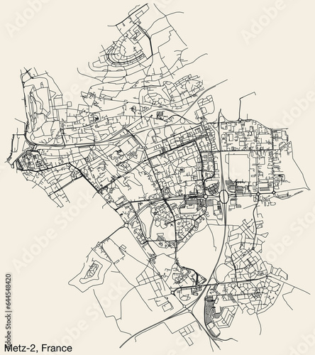 Fototapeta premium Detailed hand-drawn navigational urban street roads map of the METZ-2 CANTON of the French city of METZ, France with vivid road lines and name tag on solid background