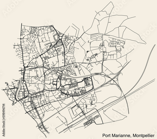 © Momcilo, Naklejka premium Detailed hand-drawn navigational urban street roads map of the PORT MARIANNE QUARTER of the French city of MONTPELLIER, France with vivid road lines and name tag on solid background