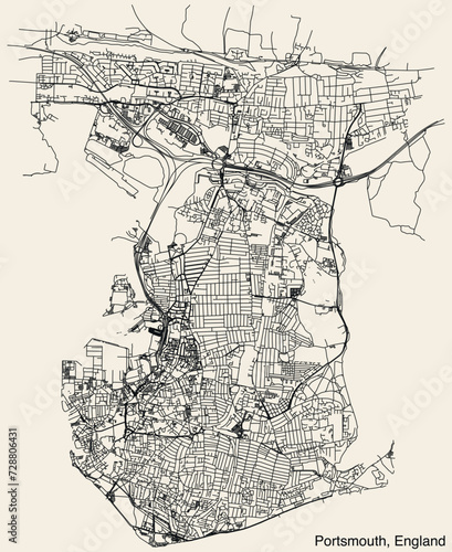 © Sanja, Fototapeta premium Detailed hand-drawn navigational urban street roads map of the United Kingdom city township of PORTSMOUTH, ENGLAND with vivid road lines and name tag on solid background