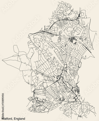 Fototapeta premium Detailed hand-drawn navigational urban street roads map of the United Kingdom city township of WATFORD, ENGLAND with vivid road lines and name tag on solid background